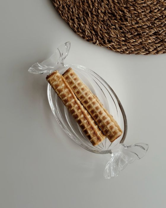 Platou din sticlă transparentă, realizat în formă de bomboană, ideal pentru servirea deserturilor. Designul original atrage atenția și adaugă un element decorativ mesei. Suprafața netedă este ușor de curățat și rezistentă. Perfect pentru biscuiți, dulciuri sau gustări. Sticla clară evidențiază conținutul într-un mod elegant. Potrivit pentru ocazii speciale sau utilizare zilnică.